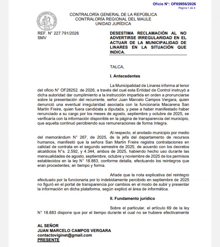 El oficio, dice relación con una bullada denuncia pública que realizó el concejal linarense, Marcelo Campos Vergara. El mismo documento, señala también que la Municipalidad de Linares tampoco cometió irregularidades en los procedimientos administrativos respecto de los días de permiso de la ex subdirectora del área social municipal.