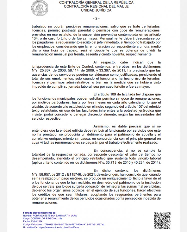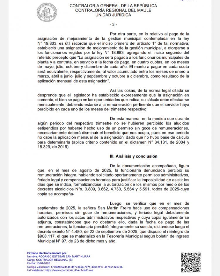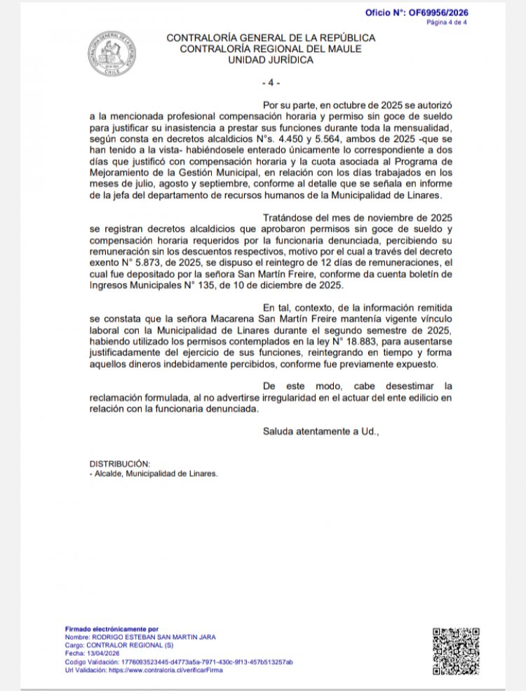 La indagatoria del organismo, señala también que la Municipalidad de Linares tampoco cometió irregularidades en los procedimientos administrativos respecto de los días de permiso de la ex subdirectora de DIDECO. San Martín, es la actual SEREMI de Ciencias en las Regiones del Maule y O’Higgins. La denuncia fue realizada en su instante por el concejal Marcelo Campos Vergara. Aquí el documento oficial de la Contraloría General de la República de la Región del Maule y sus conclusiones.