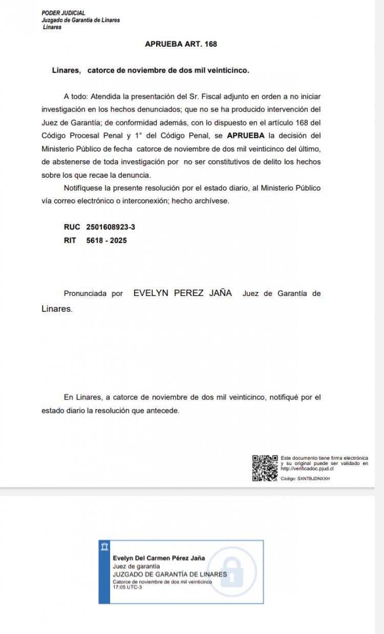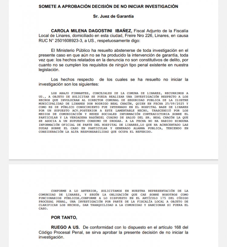 El Diario Digital Séptima Página Noticias accedió a los documentos judiciales que establecen que los hechos que involucraron, a fines de septiembre pasado, al director comunal de Seguridad Pública Municipal de Linares, Rodrigo Beals Chacón no constituyen delito.