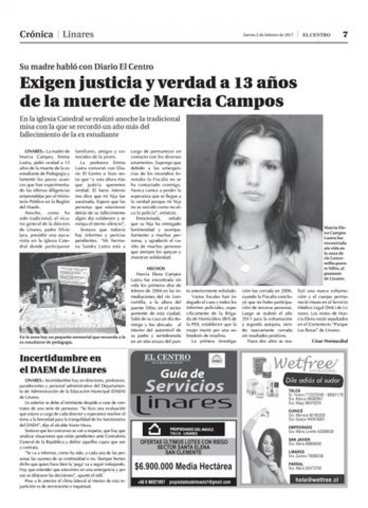 "Este domingo se cumplen 22 años de la muerte de Marcia Campos Lastra. Veintidós años desde aquel domingo 01 de febrero de 2004 en que su vida se apagó tras un shock hipoglucémico provocado por una sobredosis de insulina. Veintidós años de dolor, de silencio impuesto y de una búsqueda incansable que jamás obtuvo respuestas", indica el documento remitido por la ex Seremi del Área Social en el Maule.