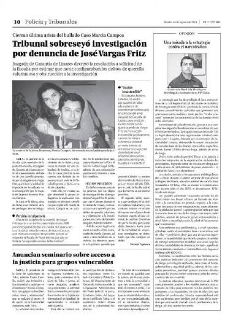 Luego, agrega que "el Ministerio Público investigó su muerte, pero no hubo resultados, no hubo verdad, no hubo justicia. A pesar de la lucha incansable de su familia, de años golpeando puertas, de súplicas, de esperanzas rotas, el sistema falló. Falló una y otra vez. La impunidad fue más fuerte. Hoy, después de más de dos décadas, lo único que persiste es la amarga sensación de una enorme deuda de la justicia chilena con Marcia. Una deuda construida con indiferencia, con investigaciones inconclusas, con el abandono de quienes solo pedían saber qué ocurrió realmente. Han sido años de sufrimiento, de desgaste emocional, de desesperanza, de aprender a convivir con la ausencia y con la rabia de no tener respuestas".