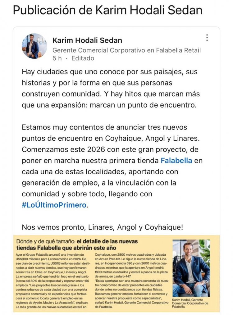 El gerente comercial corporativo de Falabella, Karim Hodali confirmó, a través de sus redes sociales, el aterrizaje de la reconocida tienda en la ciudad de Linares.