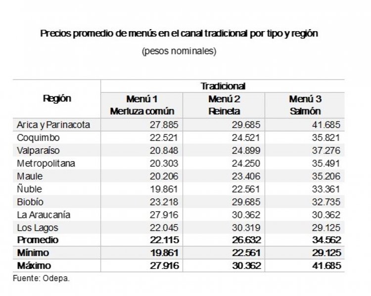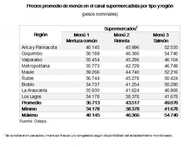 Entre las conclusiones, la directora (S) de Odepa, Daniela Acuña, señaló qué: Al analizar los costos del menú según el tipo de pescado, se observa que aquellos que incluyen salmón presentan los valores más elevados, con un promedio de ($34.562) en el canal tradicional y de ($49.070) en supermercados. Por el contrario, la alternativa más económica corresponde al menú con merluza común, cuyo valor promedio alcanza los ($22.115) en el canal tradicional y ($36.713) en supermercados.